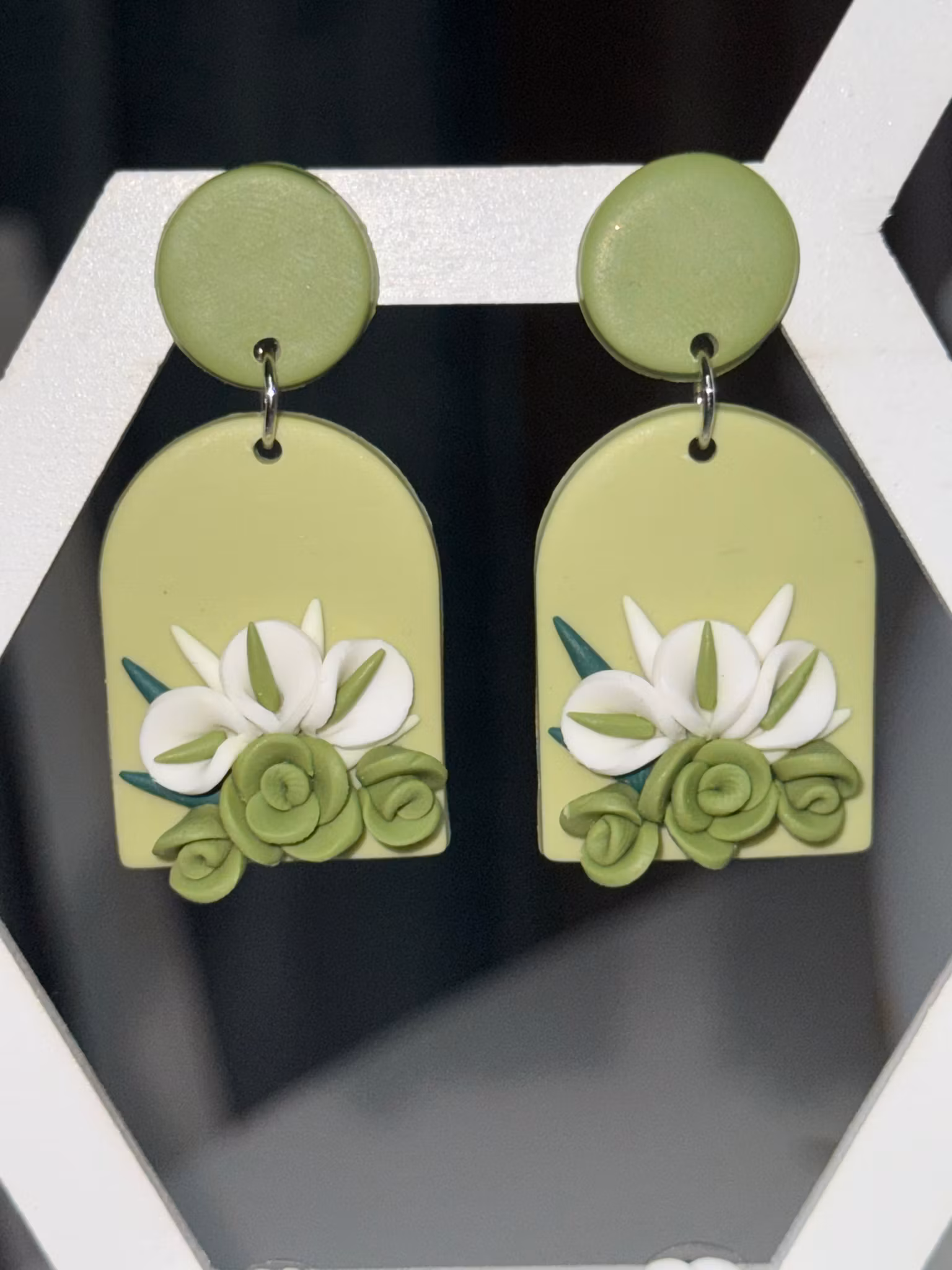 Handgjorda lotusörhängen i polymerlera med detaljerade blommor i gröna och vita toner. Lätta, unika och perfekta för dig som älskar naturinspirerade smycken.